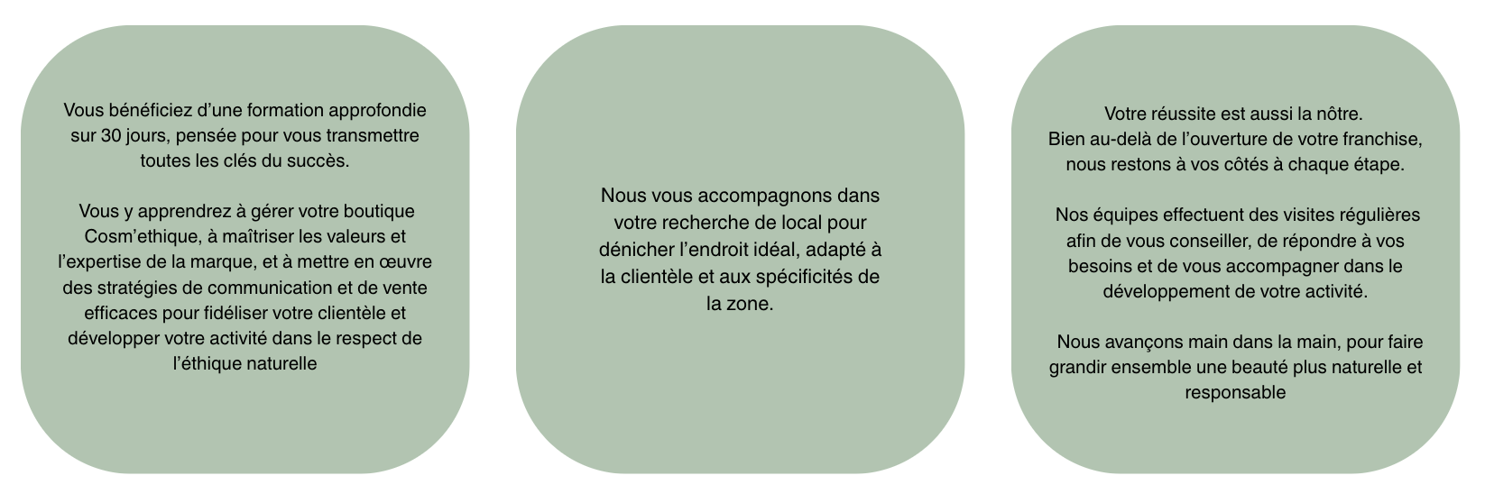 Nous recherchons avant tout des entrepreneurs passionnés, animés par la volonté de donner du sens à leur activité . Rejoignez notre réseau, ce n’est pas simplement investir dans une franchise, c’est devenir acteurs d’un projet éthique et durable , où la beauté naturelle et le respect de l’environnement sont au cœur de chaque action.